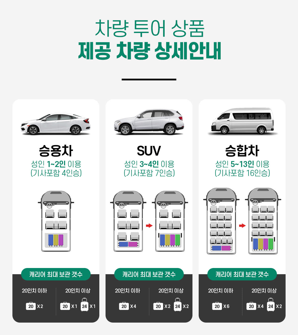 성인 1-2인 승용차 추천 / 3-4인은 SUV 차량 추천 / 성인 4-13인은 승합차 추천