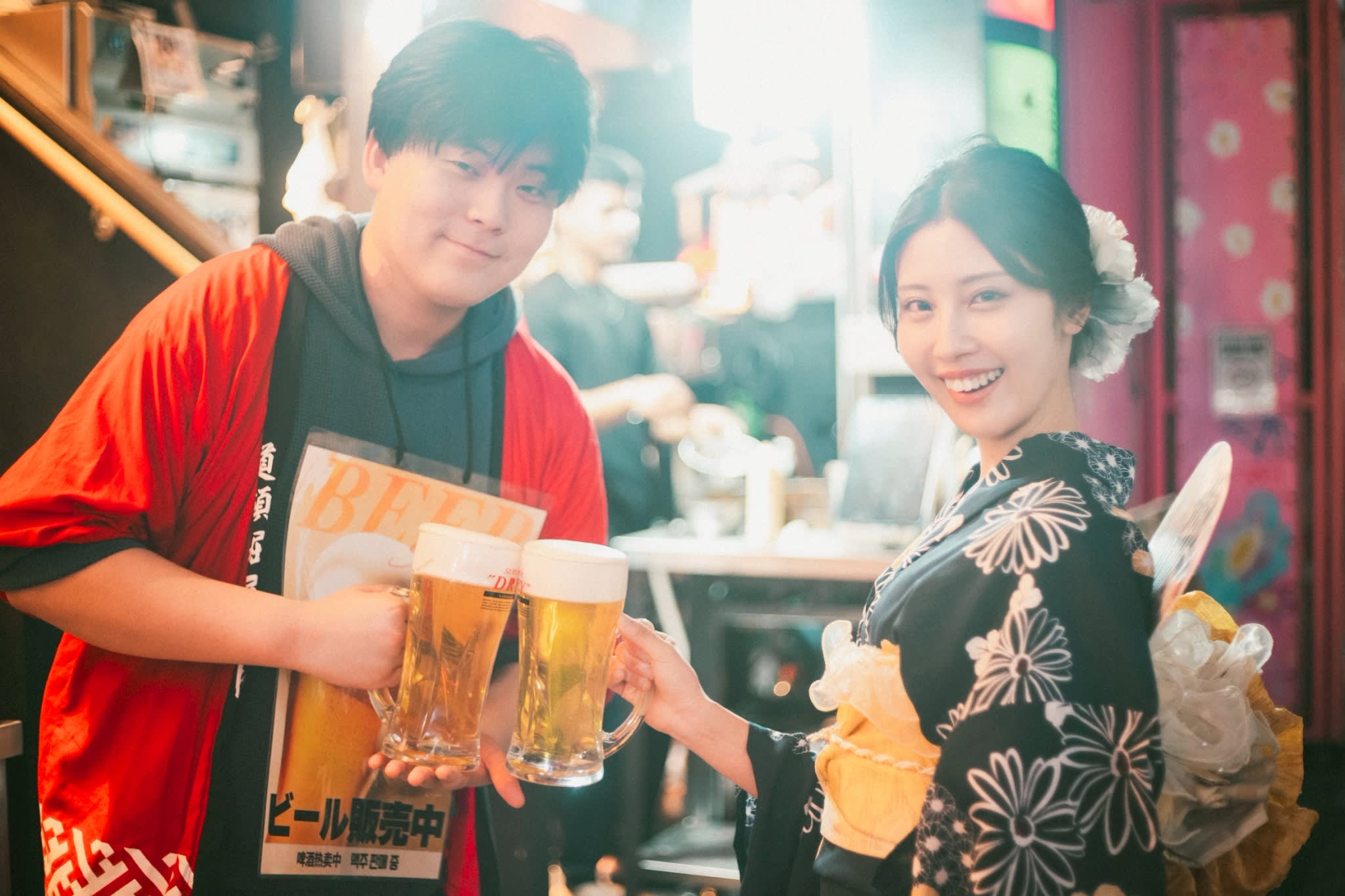 그런 곳에 탄생한 이 포장마차 마을에서는 사계절의 다양한 포장마차 음식이 즐비합니다! 타코야키, 야키소바, 쿠시카츠, 오코노미야키 등 오사카 명물은 물론 해산물 구이와 포장마차 음식의 대표 메뉴인 닭튀김 등, 저절로 길거리 음식을 즐기고 싶어지는 메뉴가 가득합니다. 게다가 술 한 잔을 들고 즐기는 '음주 스타일'로 축제 분위기가 단숨에 고조됩니다. 일본 북과 아와오도리 스테이지가 정기적으로 개최되어 활기찬 연출이 분위기를 더욱 고조시켜 마치 진짜 축제에 있는 듯합니다.